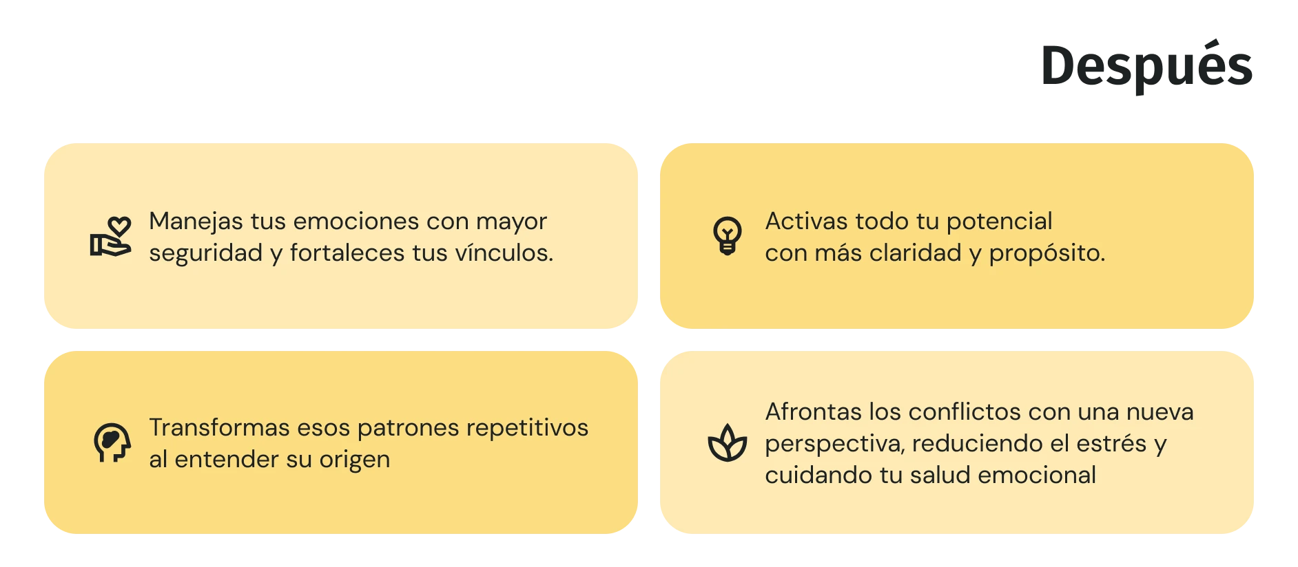 Ahora tengo una perspectiva completamente diferente sobre mis conflictos y herramientas claras para afrontarlos. Es una experiencia que definitivamente marcó un antes y un después en mi bienestar